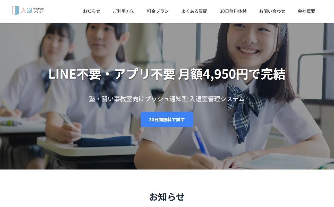 学習塾向け定額プッシュ通知入退室管理システム | webpush入退クラウド | 学習塾向け定額プッシュ通知入退室管理システム